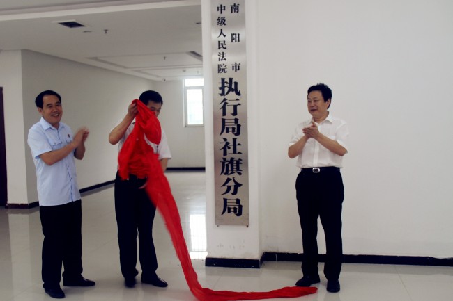 会前,县委常委、政法委书记邱国彦、县人大常委会副主任刘群才和县法院党组书记、院长裴宗全共同为南阳市中级人民法院执行局社旗分局揭牌。