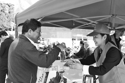 4月6日,在社旗县举行的“赊店老酒杯”河南省第二届曲艺展演上,该县人民法院组织10余名青年党员代表及入党积极分子开展学雷锋志愿者服务活动,以实际行动践行雷锋精神,最大限度地为群众提供服务。图为志愿者为观众免费发放茶水。焦典范摄