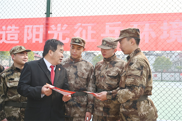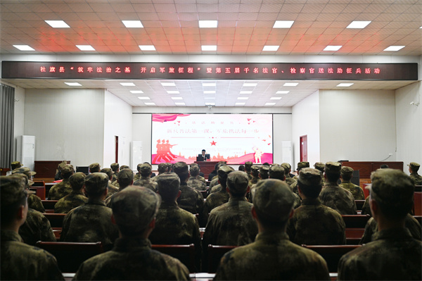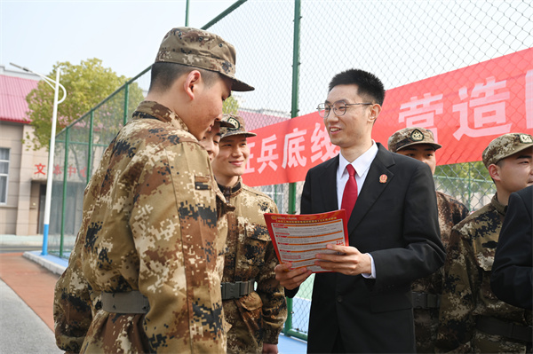 阳春三月,戎装待发。为从源头上筑牢预定新兵法治根基,助力强军兴军事业,3月11日,社旗县人民法院机关党委副书记刘枫林、民事审判一庭负责人詹兴合一行走进县人武部,开展“送法进军营”活动,通过一堂干货满满的“法治第一课”,为即将踏入军营的“准新兵”系好军旅生涯的“第一粒法治扣子”。