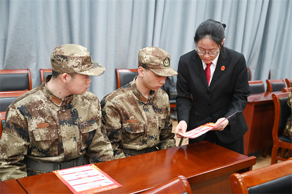 互动环节中,面对新兵们抛出的关于婚姻家事、网络安全等现实问题,詹兴合法官进行“一对一”答疑解惑。一问一答间,法治的种子在轻松融洽的氛围中悄然播下。讲座结束后,法院干警向预定新兵们赠送了精心编印的普法宣传彩页,这份“法治行囊”聚焦国家安全、网络安全、保密法规等关键领域,既是一份从军指南,更是一纸平安嘱托。