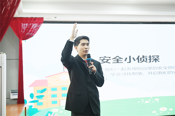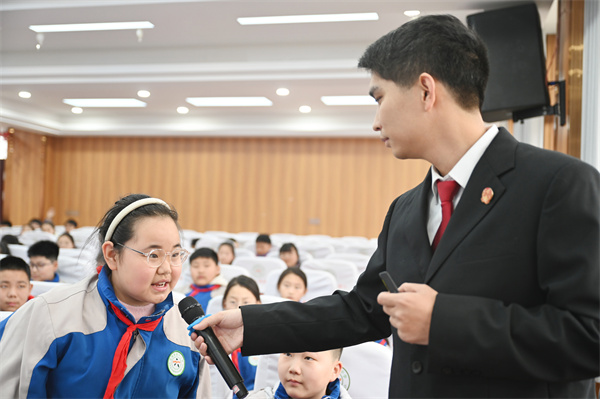 课堂上,法官助理张益境以《“旗”心护蕾 安全“童”行》为题,带领同学们化身“安全小侦探”,共同探寻校园生活中的安全隐患与危险行为。立足小学生认知特点,张益境围绕“校园活动安全”“向校园欺凌说不”“网络安全陷阱”“交通安全须知”四大板块,通过生动的小故事、真实案例和互动问答,将法律知识融入日常场景,深入浅出地讲解与青少年密切相关的法律常识。在校园活动安全环节,他剖析日常行为背后的法律风险,引导同学们增强规则意识;面对校园欺凌话题,他清晰界定欺凌行为,传授“勇敢应对、及时求助”的正确方式;针对网络风险,他教会同学们辨别信息真伪,牢记“网络安全口诀”;针对交通安全,他以互动问答形式,让“几岁能骑车”“过马路秘籍”等实用知识深入人心。