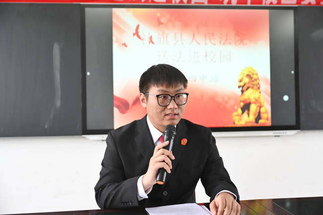 活动现场,吴志浩法官以校园欺凌典型案例为切入点,结合《中华人民共和国民法典》《中华人民共和国刑法》《中华人民共和国未成年人保护法》等法律法规,用通俗易懂的语言,讲解网络安全、校园安全等与青少年日常学习生活息息相关的内容,引导学生增强法律意识和自我保护能力,自觉遵纪守法、加强自我约束,远离不良行为,提升安全防范能力。